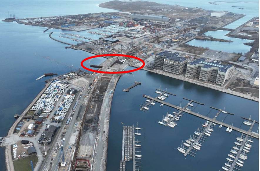 Vejdirektoratets entreprenør skal have fjernet sten og sand samt vibreret og skåret spuns, så vi igen kan komme ud og ind af Svanemøllehavnen. Så arbejderne foregår på arbejdsplatformen i Kalkbrænderiløbet.